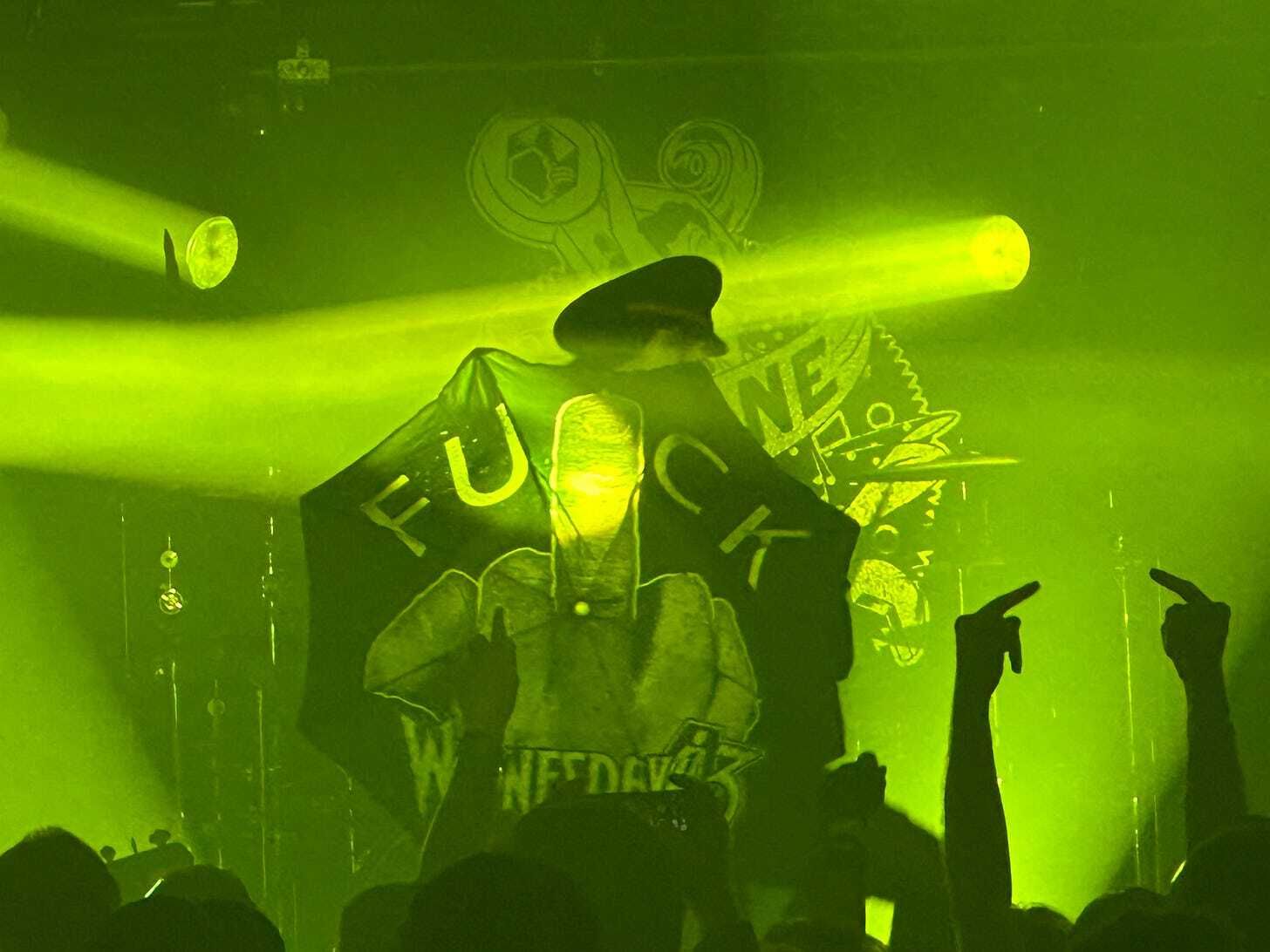 Seeing Wednesday in person is quite the experience. The whole band has the make-up and leather look of many a scary metal band, but the music has both an edge and a crazy sense of humor. You simply can’t not smile when the singer is telling you to raise your middle finger in the air for the song “I Love To Say Fuck” (the perennial encore/show closer) while he flashes an umbrella…well, just look at the picture.