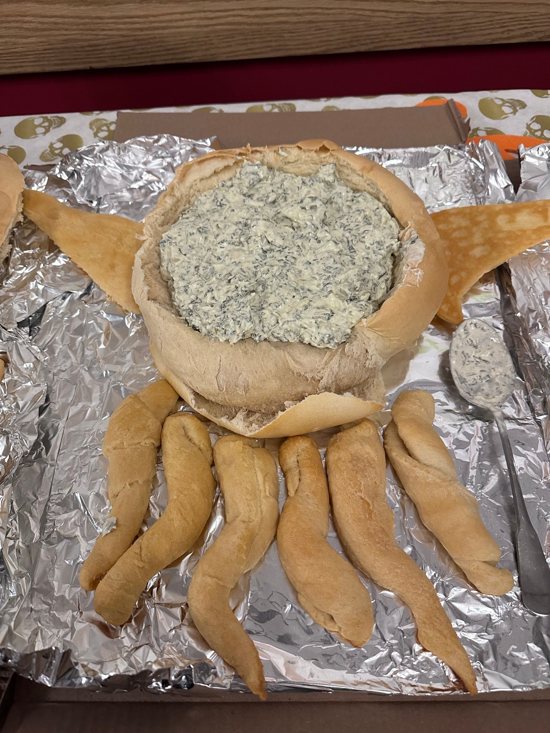 I attempted a bread/dip version of Cthulhu for the food table. It came out well and sort of looks like the Great Old One if you squint at it with one eye.
